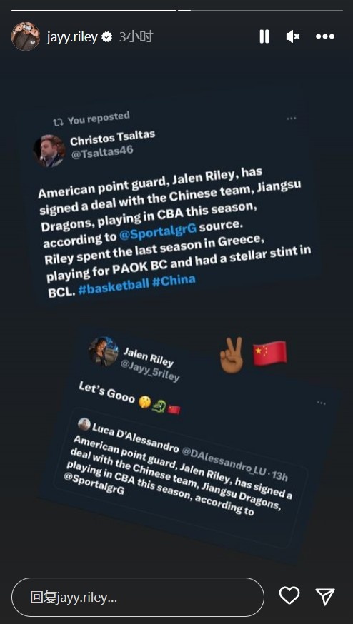 jrs直播10月10日讯 今日,美籍后卫杰伦-赖利更新INS,自宣加盟江苏男篮。