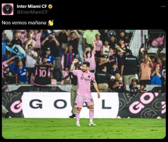 迈阿密国际官推的这条动态似乎印证了这一个说法,他们用西语为照片配文“明天见”,这对迈阿密来说无疑是一个利好消息,在梅西缺阵期间,球队成绩并不理想。