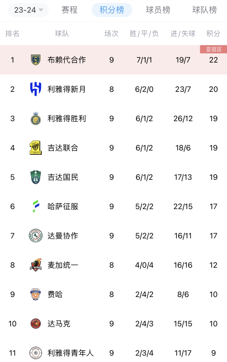 沙特联第9轮两场战罢,吉达国民1-0吉达联合,利雅得胜利2-2艾卜哈。积分榜上,布赖代合作暂居榜首,利雅得胜利、吉达联合、吉达国民同积19分,分列第3至第5位。