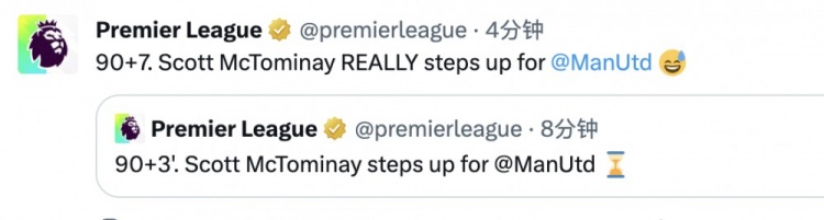 小麦临危救主!英超官推两度发文:麦克托米奈为曼联挺身而出