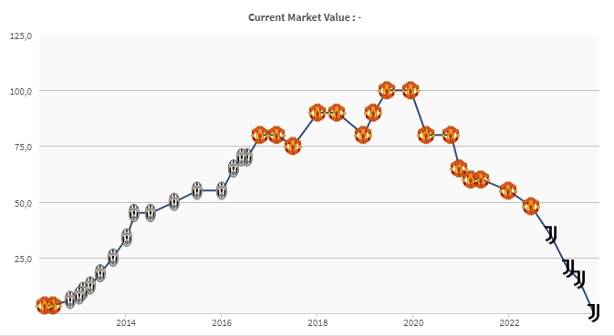 在德转上,博格巴的身价一度来到1亿欧,但近年来他一路下滑,最终因为误服禁药被删除了身价。