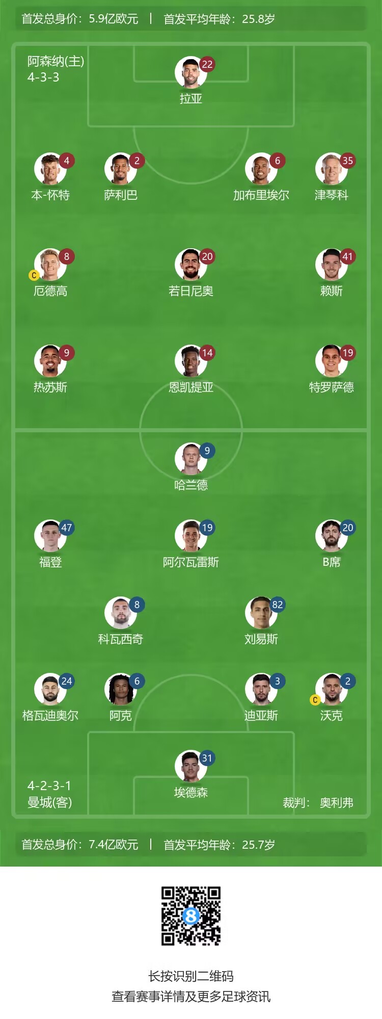 阿森纳首发:22-拉亚、4-怀特、2-萨利巴、6-加布里埃尔、35-津琴科、41-赖斯、20-若日尼奥、8-厄德高、19-特罗萨德、9-热苏斯、14-恩凯提亚