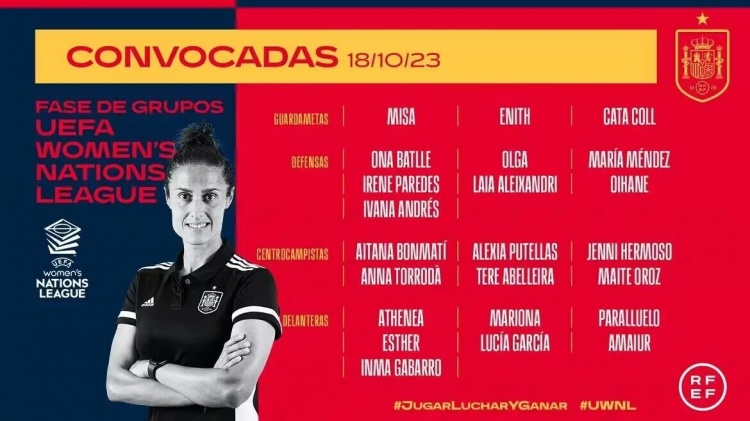 前锋:雅典娜-德尔卡斯蒂略(皇家马德里)、玛丽娜-卡尔登泰(巴塞罗那)、帕拉尔卢埃洛(巴塞罗那)、埃丝特-冈萨雷斯(新泽西/纽约哥谭女子足球队)、露西亚-加西亚(曼联)、阿麦乌尔(皇家社会)、伊玛-加瓦罗(塞维利亚)