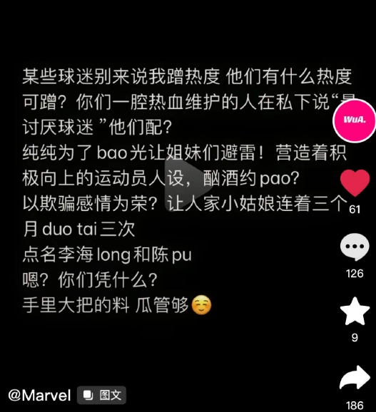 今日,网传有一位网名为“marvel”的博主曝光泰山球员李海龙和陈蒲。