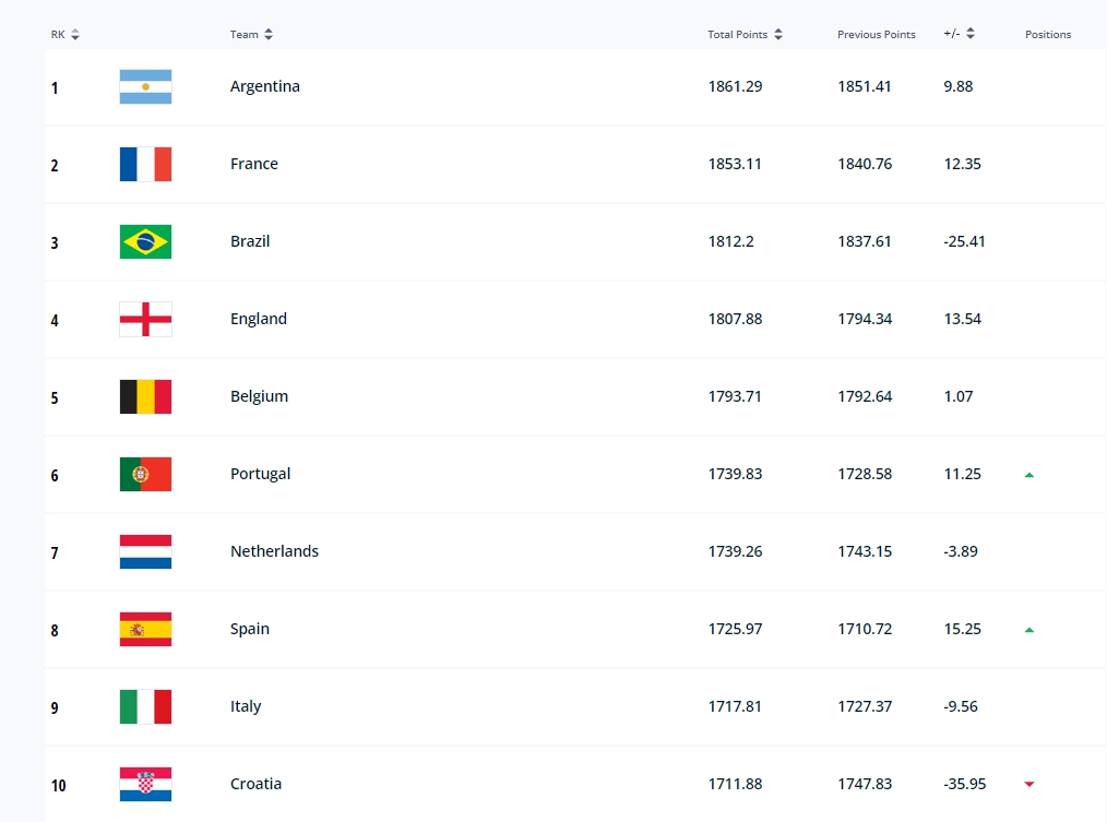 jrs直播吧10月26日讯 FIFA最新一期世界排名出炉,日本再升一位至第18位,德国降一位至第16位,阿根廷继续排名世界第一。
