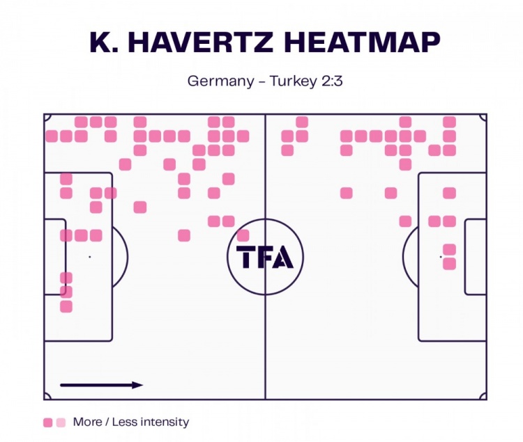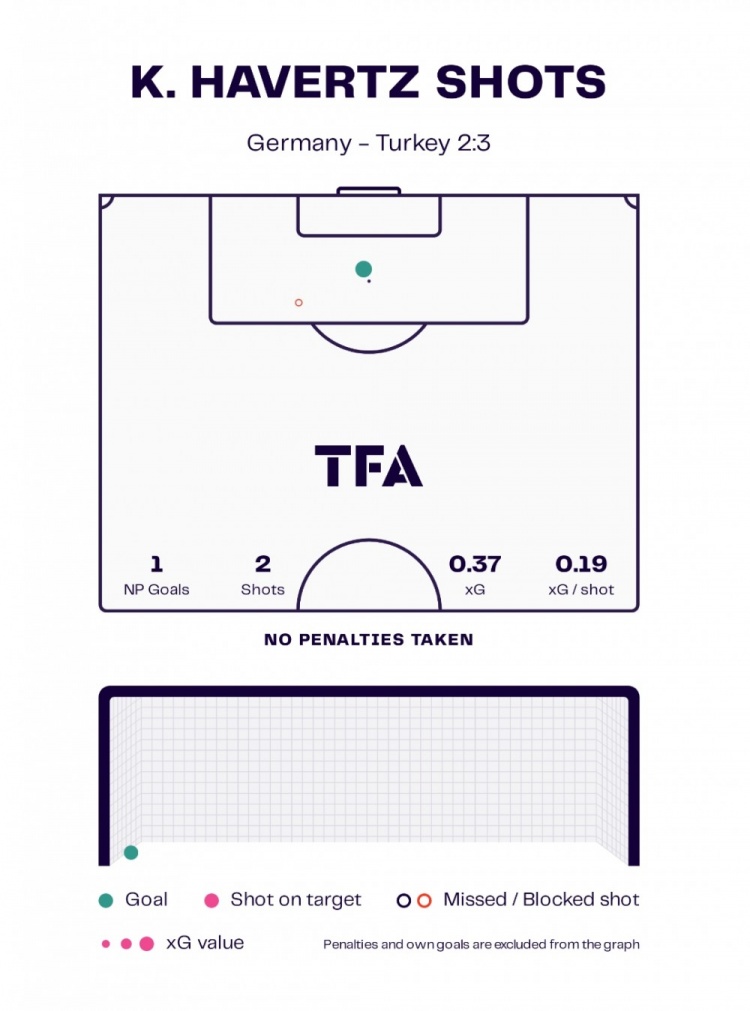 对阵土耳其的比赛中,哈弗茨在左边卫的位置上表现积极,也能从容面对挑战。虽然他没有太多的触球次数,也没有频繁接受对手的考验,但他很好地挟制住了对手的进攻,并有效地完成了自己的盯防任务。而且值得注意的事,哈弗茨还为德国攻入一球——他在禁区内巧妙的站位,接应萨内的传球后破门。