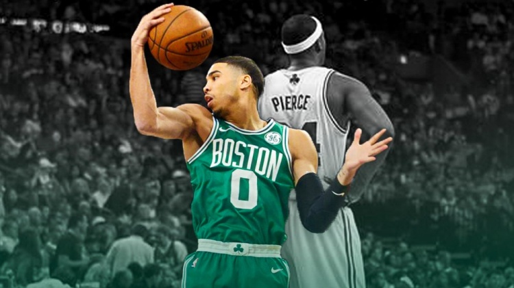 看得出来,这四位巨星(拉塞尔、哈弗利切克、伯德、皮尔斯)都是领军人物,从这个角度出发,塔图姆也算在内,是并不为过的。塔图姆来自杜克,2017年被凯尔特人时任总管丹尼-安吉施展空空妙手,以探花签选中,随后便成为领军者。迄今为止,他已4次入选全明星,3次入选最佳阵容。他和杰伦-布朗一起,率领凯尔特人3次杀入东决,1次杀入总决赛,但未能夺冠。