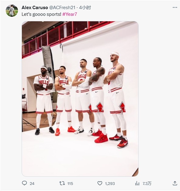 10月7日讯 公牛球员卡鲁索今日在个人社媒晒出新赛季定妆照,并写道:“第七个赛季,让我们开打吧!”