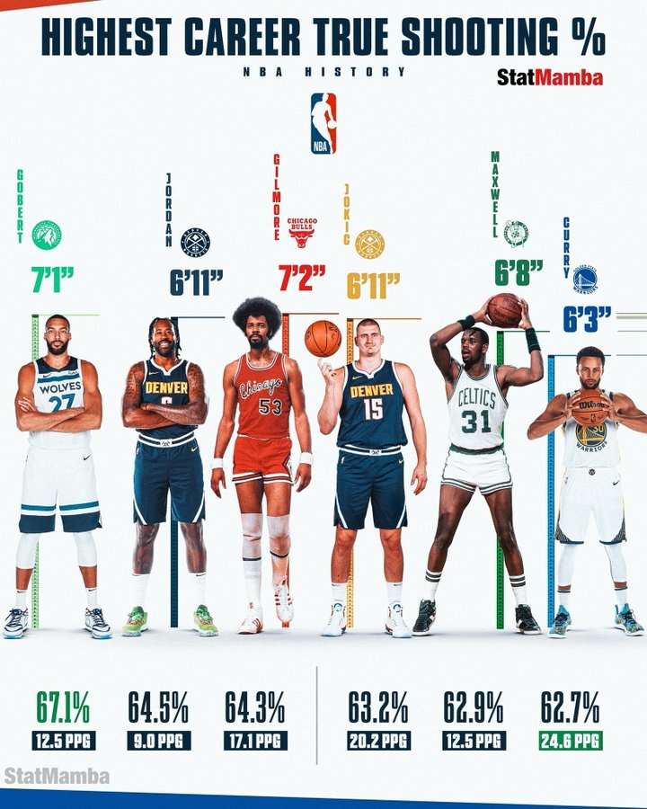 混进去一个奇怪的人!生涯真实命中率排行:前五都是中锋 库里第六