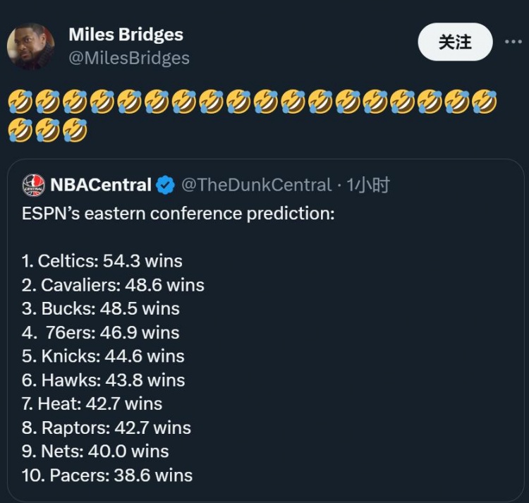 ESPN预测黄蜂38胜排东部第11 小桥转发并配发21个笑哭表情包
