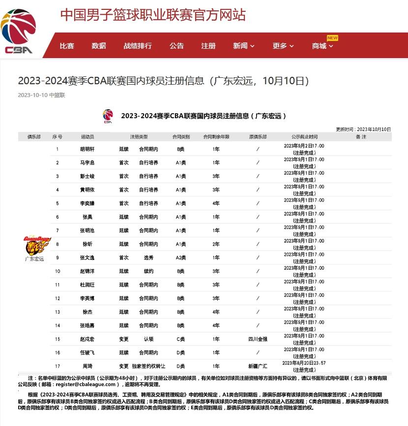 jrs直播10月10日讯 今日,CBA官网更新了2023-2024赛季CBA联赛国内球员注册信息。
