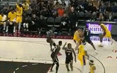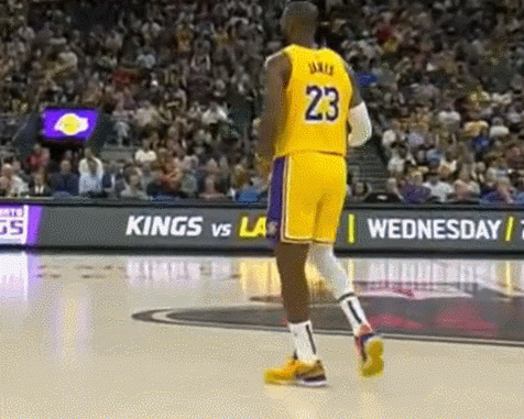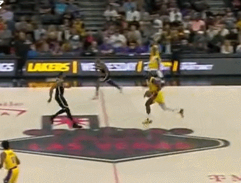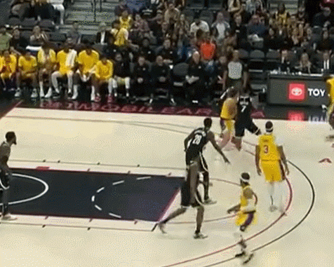 这一个球是往外线的传球。詹姆斯刚过半场,将对方阵型稍作观察后,将球交给刚从底角逡巡到高位45度角的八村垒,后者起跳直接将球送往篮筐。
