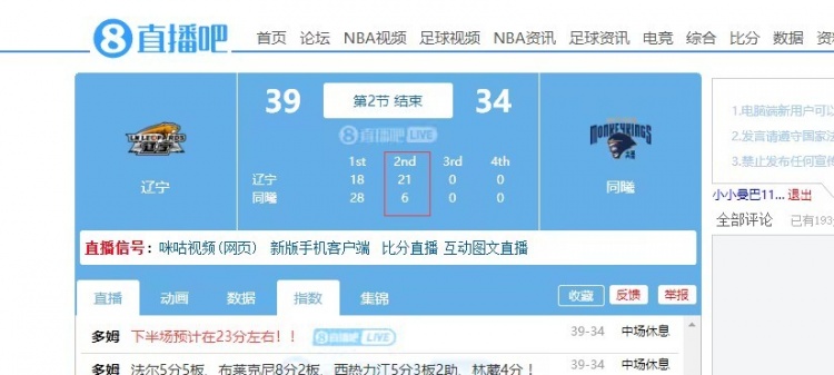 jrs直播10月13日讯 CBA季前赛,辽宁半场结束39-34领先同曦。