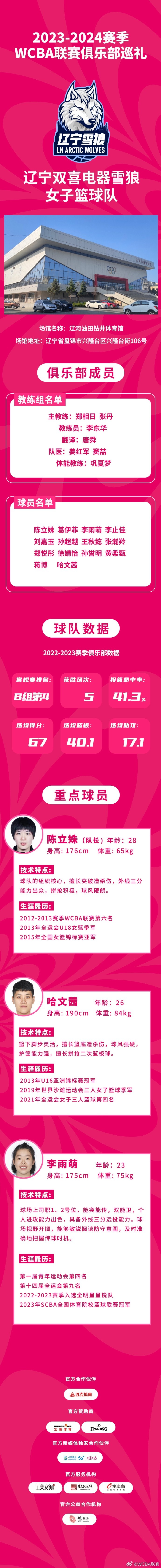 jrs直播10月27日讯 今日,WCBA官博发布了新赛季巡礼之辽宁女篮。