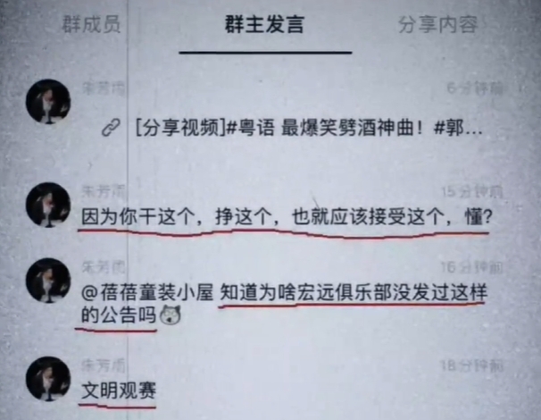 有球迷询问,当初杜锋和胡明轩被漫画侮辱时,宏远俱乐部为何没有像辽宁支持张镇麟一样站出来发声?朱芳雨的回应则是:“知道为啥宏远俱乐部没有发过这样的公告吗?因为你是干这个,挣这个的,也就应该接受这个,懂?”
