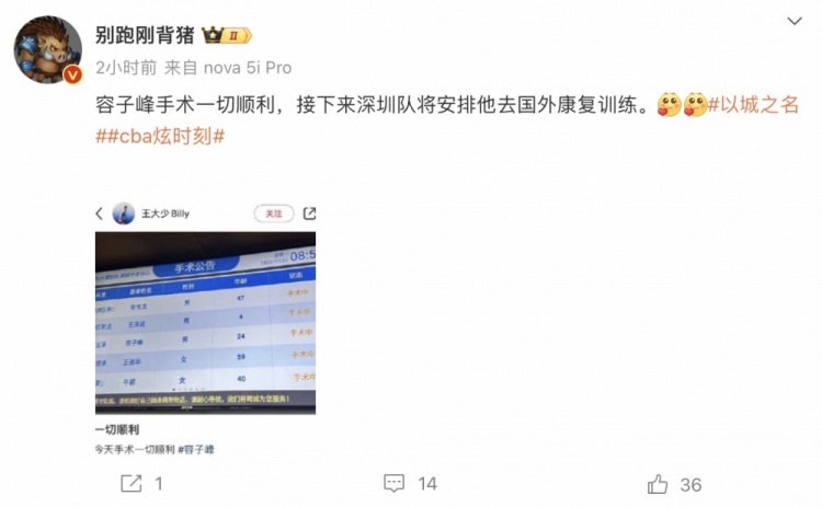 微博原文:“容子峰手术一切顺利,接下来深圳队将安排他去国外康复训练。”