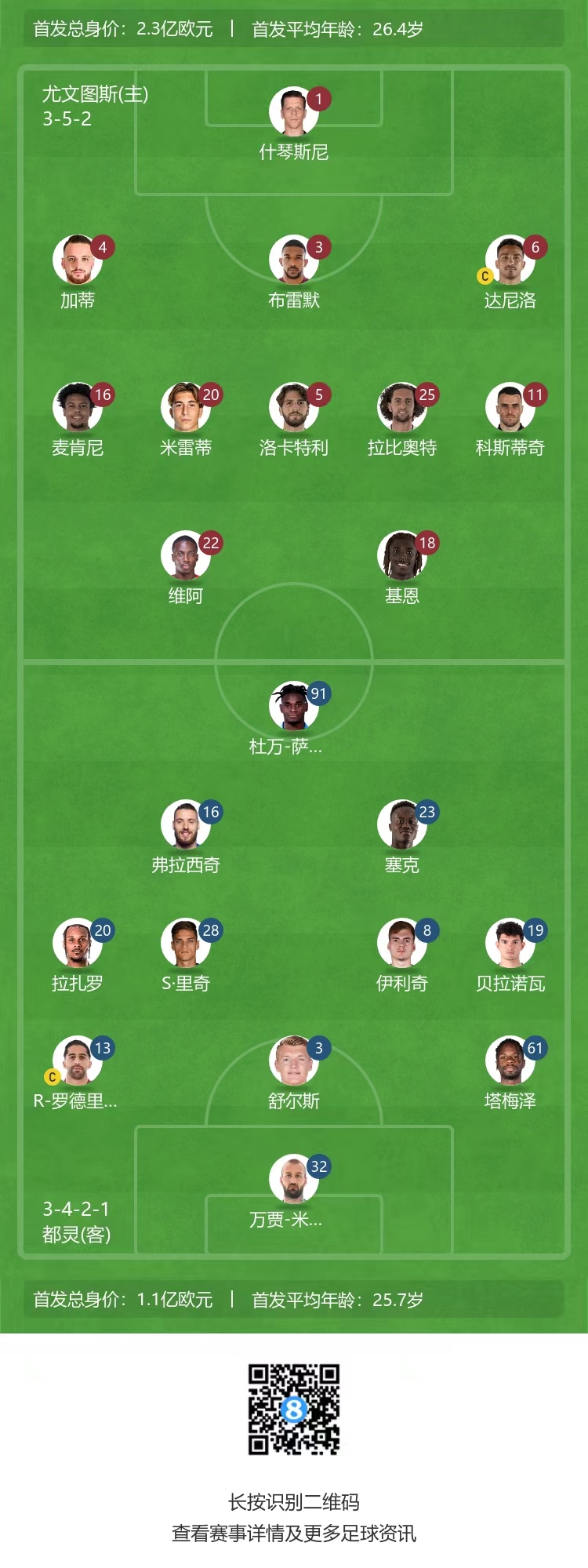尤文首发:1-什琴斯尼、4-加蒂、3-布雷默、6-达尼洛、22-维阿、16-麦肯尼、5-洛卡特利、25-拉比奥特、11-科斯蒂奇、20-米雷蒂、18-基恩