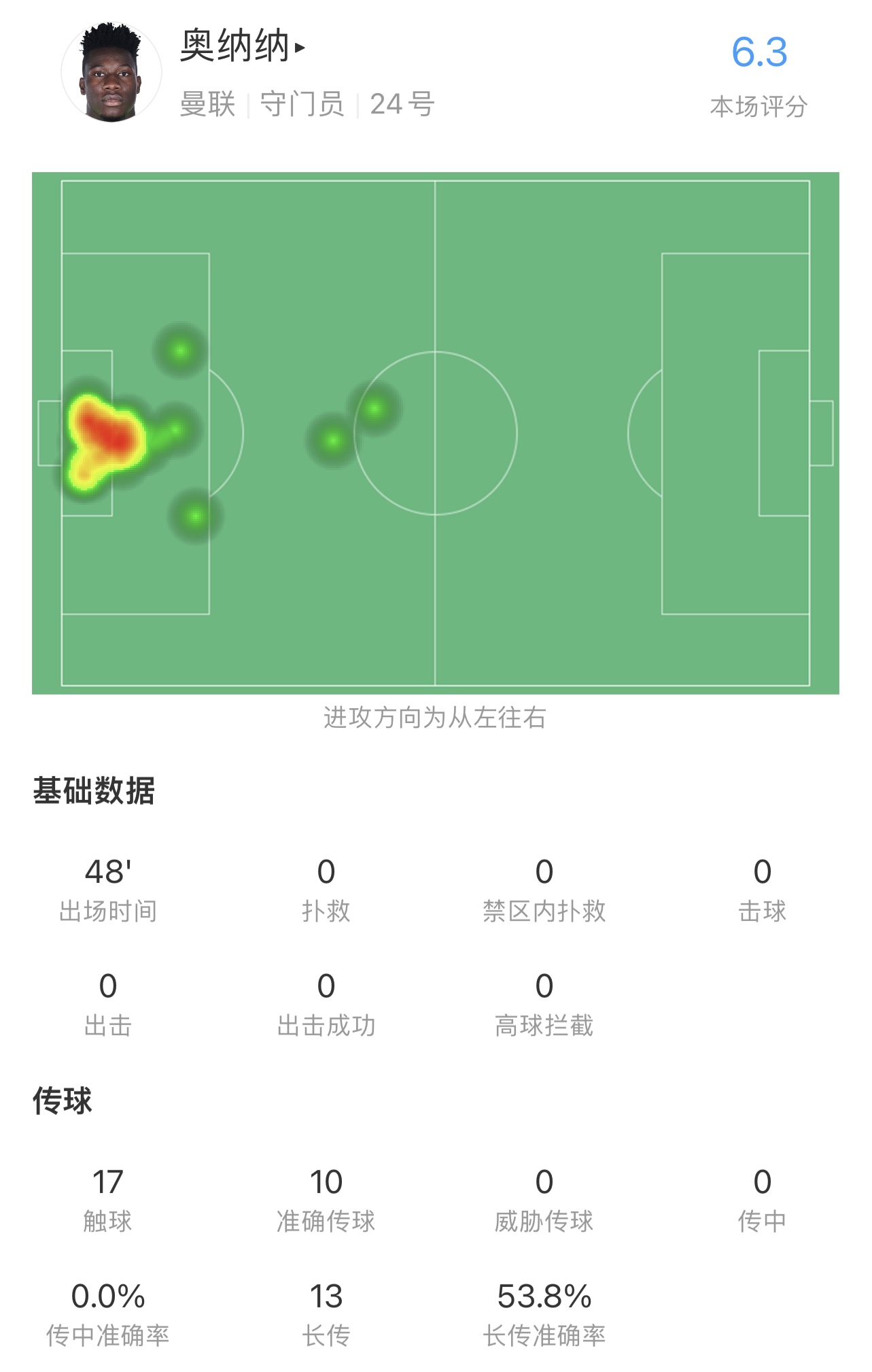 0扑救1失误!奥纳纳半场数据:17次触球其中13次长传,评分6.3