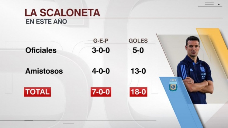 据ESPN统计,斯卡洛尼2023年带领阿根廷参加7场比赛,全部取胜,打进18球,未失一球。
