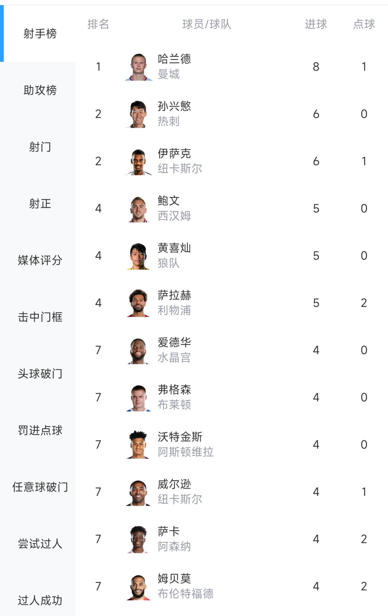 但由于随后比赛中伊萨克梅开二度,与孙兴慜并列第二,黄喜灿降至并列第三位。