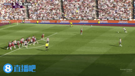 伤停补时2分钟。上半场比赛结束,西汉姆1-0纽卡斯尔。