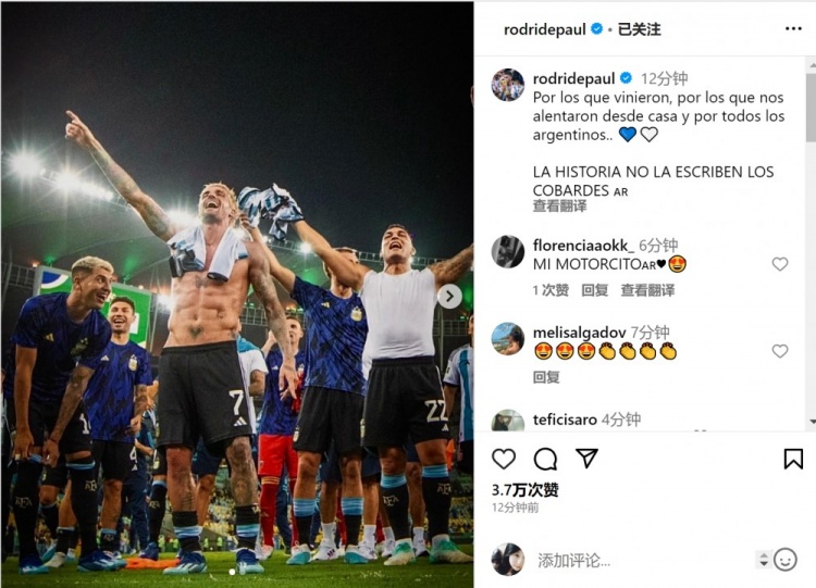德保罗在社交媒体上晒出与队友欢庆胜利的照片,并写道:“胜利献给那些来到这里的人,献给那些在国内为我们加油的人,献给所有阿根廷人。”
