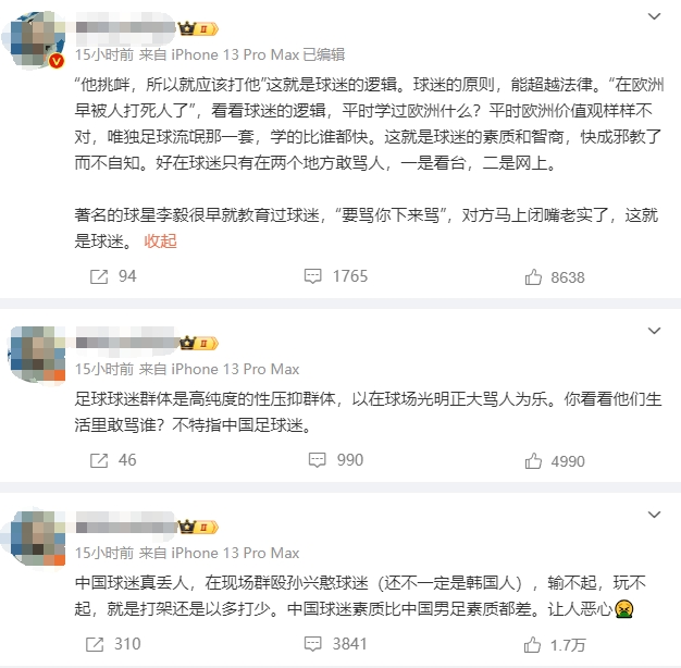 “中国球迷真丢人,在现场群殴孙兴憨球迷(还不一定是韩国人),输不起,玩不起,就是打架还是以多打少。中国球迷素质比中国男足素质都差。让人恶心